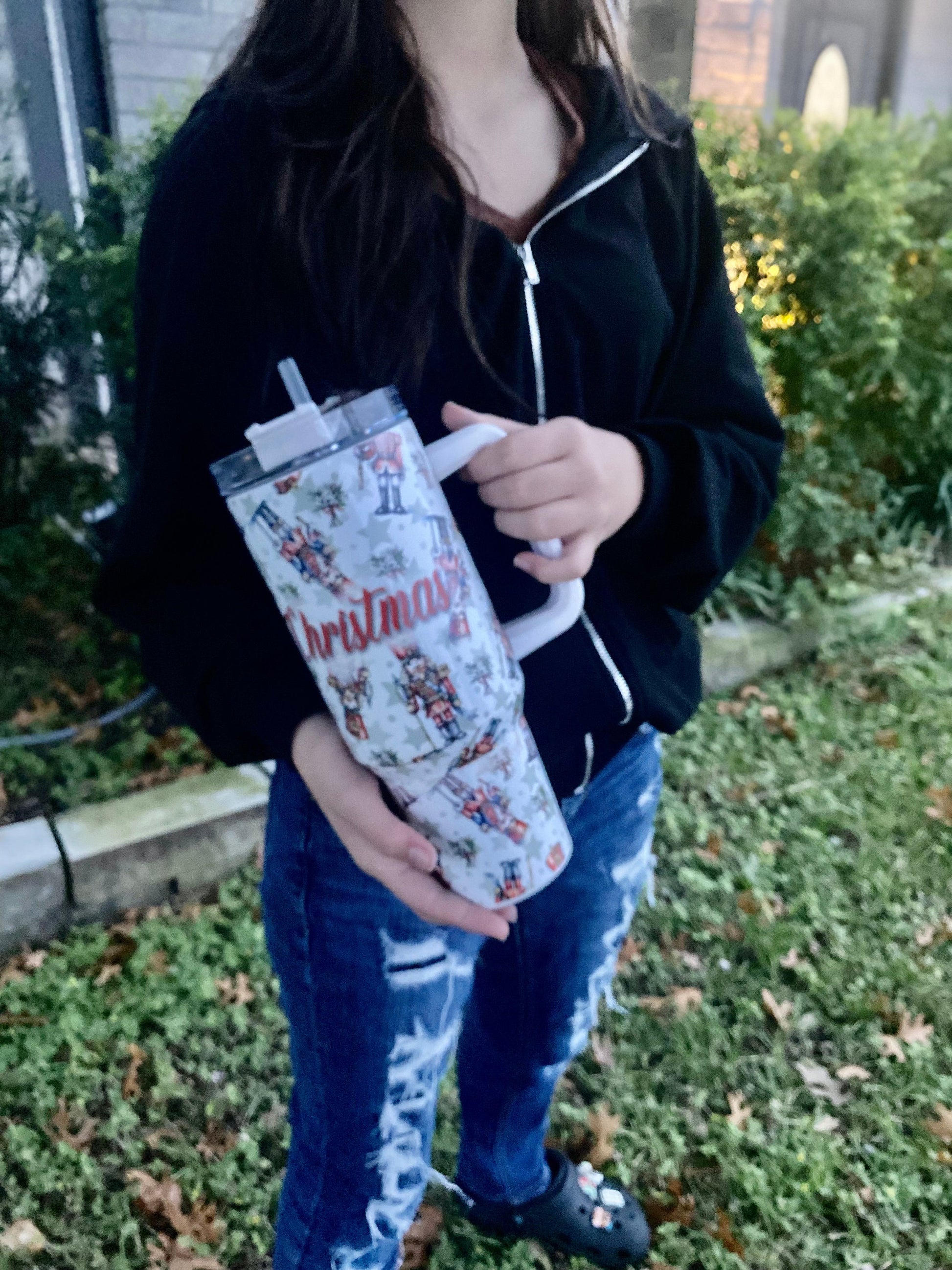 Christmas nutcracker tumbler with a handle and straw. Nutcracker tumbler