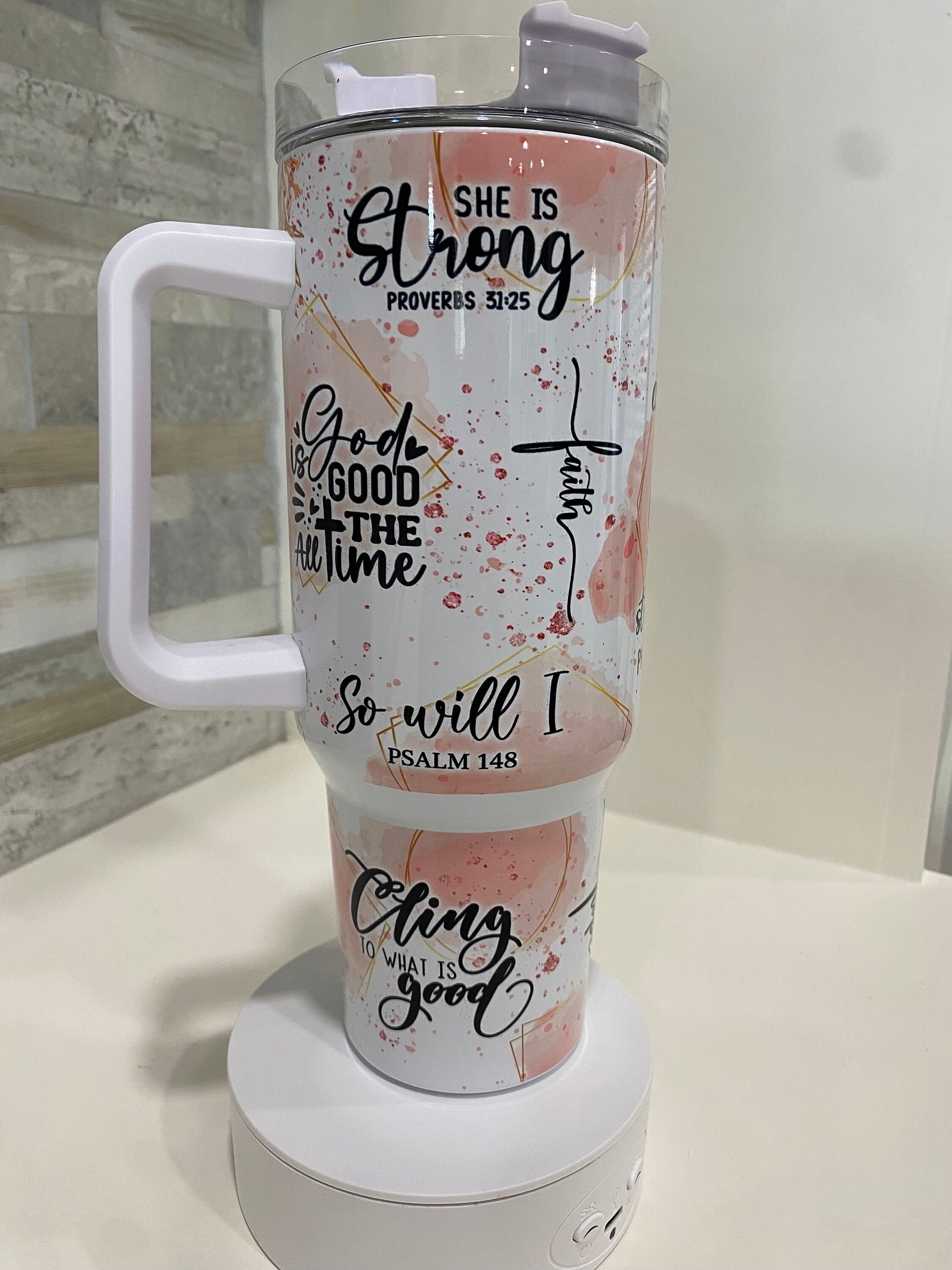Get a tumbler to show people what the Lord says and inspire others with the word of God every where you go is the purpose of this tumbler we sell. It is a stainless steel tumbler with a high-quality, glossy finish that will never fade. Our tumbler makes it easy to travel as it fits in most cup holders and keeps your drink hot or cold for many hours. Details: - 40oz sublimation stainless steel - Double wall vacuum insulated - Includes splash-free lid, straw and handle FAQ: What is the processing time? - 1-2 business days Notes: Returns are not accepted. Thank you for supporting our small businesses. Please feel free to message us if you have any questions or concerns.